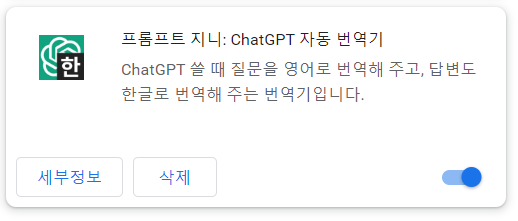 챗지피티는 영어가 기본 언어이기 때문에 영어로 질문을 해야 좀 더 나은 답변이 돌아온다. 그런데 영어 잘하는 사람이 얼마나 되는가? 그래서 자동 번역을 해주는 기능이다. 사실 개인적으로 초보분들은 이거 하나만 설치하고 사용해도 충분히 뽕 뽑는다고 생각한다.