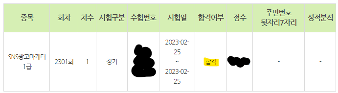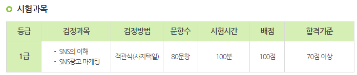 시험 과목은 'SNS 이해'와 'SNS 광고 마케팅'이고 객관식에 80문항이다. 합격 기준은 70점 이상이다.