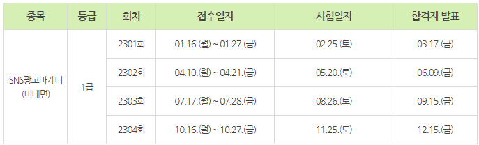 시험 과목은 'SNS 이해'와 'SNS 광고 마케팅'이고 객관식에 80문항이다. 합격 기준은 70점 이상이다.