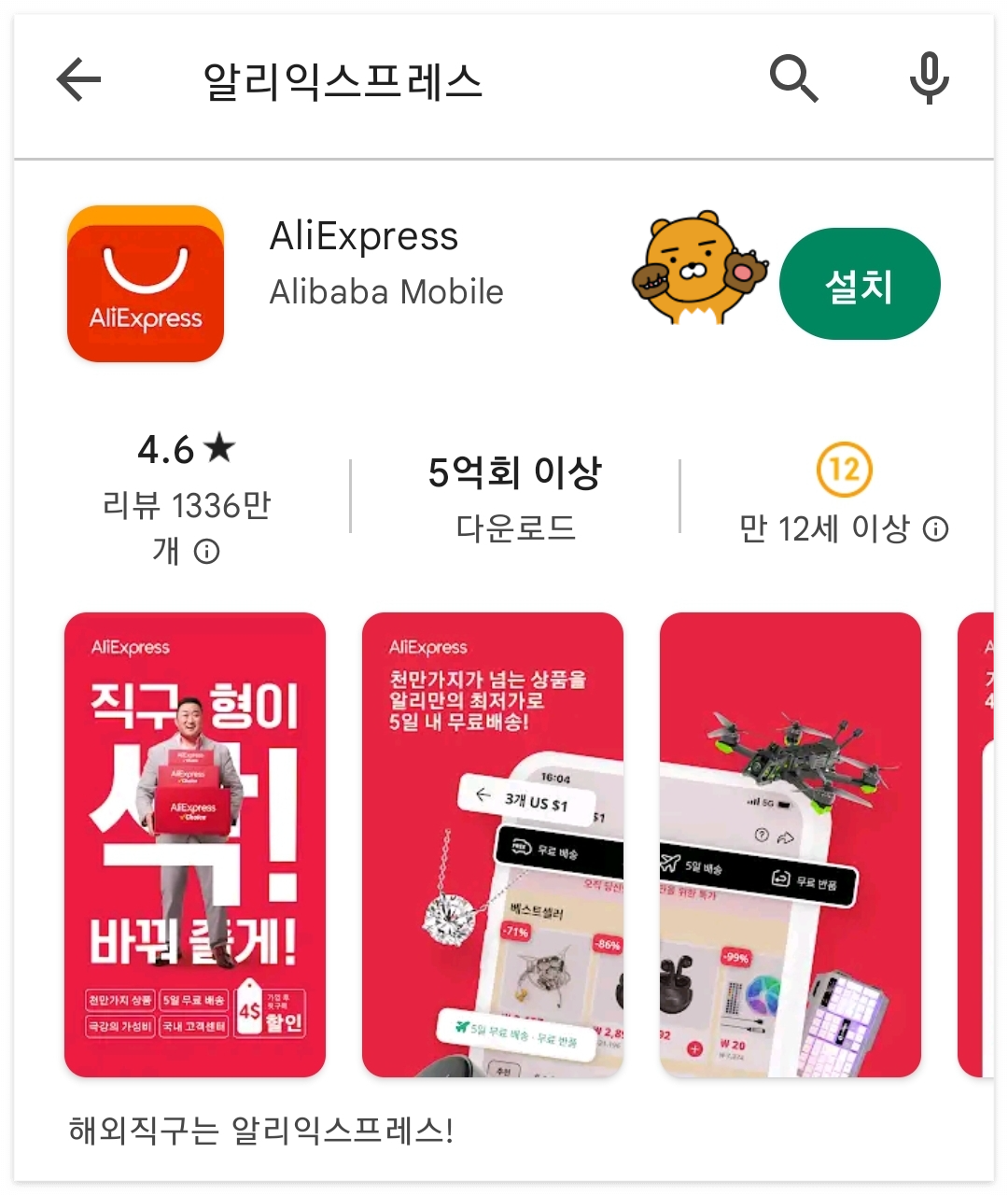 ① 구글 플레이 앱에서 '알리 익스프레스'라고 검색해서 설치를 한다.